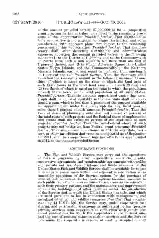 of the amount provided herein, $7,000,000 is for a competitive grant program for Indian tribes not subject to the remaining provi- sions of this appropriation: Provided further, That $5,000,000 is for a competitive grant program for States, territories, and other jurisdictions with approved plans, not subject to the remaining provisions of this appropriation: Provided further, That the Sec- retary shall, after deducting $12,000,000 and administrative expenses, apportion the amount provided herein in the following manner: (1) to the District of Columbia and to the Commonwealth of Puerto Rico, each a sum equal to not more than one-half of 1 percent thereof; and (2) to Guam, American Samoa, the United States Virgin Islands, and the Commonwealth of the Northern Mariana Islands, each a sum equal to not more than one-fourth of 1 percent thereof: Provided further, That the Secretary shall apportion the remaining amount in the following manner: (1) one- third of which is based on the ratio to which the land area of such State bears to the total land area of all such States; and (2) two-thirds of which is based on the ratio to which the population of such State bears to the total population of all such States: Provided further, That the amounts apportioned under this para- graph shall be adjusted equitably so that no State shall be appor- tioned a sum which is less than 1 percent of the amount available for apportionment under this paragraph for any fiscal year or more than 5 percent of such amount: Provided further, That the Federal share of planning grants shall not exceed 75 percent of the total costs of such projects and the Federal share of implementa- tion grants shall not exceed 65 percent of the total costs of such projects: Provided further, That the non-Federal share of such projects may not be derived from Federal grant programs: Provided further, That any amount apportioned in 2010 to any State, terri- tory, or other jurisdiction that remains unobligated as of September 30, 2011, shall be reapportioned, together with funds appropriated in 2012, in the manner provided herein.
