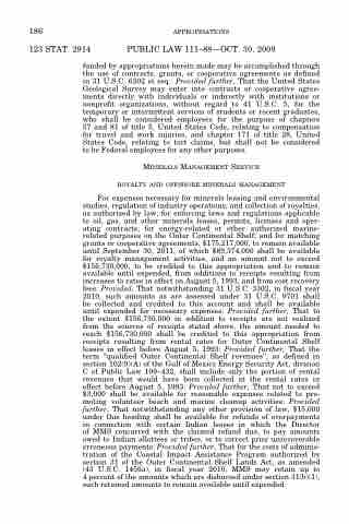 For expenses necessary for minerals leasing and environmental studies, regulation of industry operations, and collection of royalties, as authorized by law; for enforcing laws and regulations applicable to oil, gas, and other minerals leases, permits, licenses and oper- ating contracts; for energy-related or other authorized marine- related purposes on the Outer Continental Shelf; and for matching grants or cooperative agreements, $175,217,000, to remain available until September 30, 2011, of which $89,374,000 shall be available for royalty management activities; and an amount not to exceed $156,730,000, to be credited to this appropriation and to remain available until expended, from additions to receipts resulting from increases to rates in effect on August 5, 1993, and from cost recovery fees: Provided, That notwithstanding 31 U.S.C. 3302, in fiscal year 2010, such amounts as are assessed under 31 U.S.C. 9701 shall be collected and credited to this account and shall be available until expended for necessary expenses: Provided further, That to the extent $156,730,000 in addition to receipts are not realized from the sources of receipts stated above, the amount needed to reach $156,730,000 shall be credited to this appropriation from receipts resulting from rental rates for Outer Continental Shelf leases in effect before August 5, 1993: Provided further, That the term ‘‘qualified Outer Continental Shelf revenues’’, as defined in section 102(9)(A) of the Gulf of Mexico Energy Security Act, division C of Public Law 109–432, shall include only the portion of rental revenues that would have been collected at the rental rates in effect before August 5, 1993: Provided further, That not to exceed $3,000 shall be available for reasonable expenses related to pro- moting volunteer beach and marine cleanup activities: Provided further, That notwithstanding any other provision of law, $15,000 under this heading shall be available for refunds of overpayments in connection with certain Indian leases in which the Director of MMS concurred with the claimed refund due, to pay amounts owed to Indian allottees or tribes, or to correct prior unrecoverable erroneous payments: Provided further, That for the costs of adminis- tration of the Coastal Impact Assistance Program authorized by section 31 of the Outer Continental Shelf Lands Act, as amended (43 U.S.C. 1456a), in fiscal year 2010, MMS may retain up to 4 percent of the amounts which are disbursed under section 31(b)(1), such retained amounts to remain available until expended.