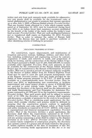For construction, repair, improvement, and maintenance of irrigation and power systems, buildings, utilities, and other facili- ties, including architectural and engineering services by contract; acquisition of lands, and interests in lands; and preparation of lands for farming, and for construction of the Navajo Indian Irriga- tion Project pursuant to Public Law 87–483, $225,000,000, to remain available until expended: Provided, That such amounts as may be available for the construction of the Navajo Indian Irrigation Project may be transferred to the Bureau of Reclamation: Provided further, That not to exceed 6 percent of contract authority available to the Bureau of Indian Affairs from the Federal Highway Trust Fund may be used to cover the road program management costs of the Bureau: Provided further, That any funds provided for the Safety of Dams program pursuant to 25 U.S.C. 13 shall be made available on a nonreimbursable basis: Provided further, That for fiscal year 2010, in implementing new construction or facilities improvement and repair project grants in excess of $100,000 that are provided to grant schools under Public Law 100–297, as amended, the Secretary of the Interior shall use the Administrative and Audit Requirements and Cost Principles for Assistance Pro- grams contained in 43 CFR part 12 as the regulatory requirements: Provided further, That such grants shall not be subject to section 12.61 of 43 CFR; the Secretary and the grantee shall negotiate and determine a schedule of payments for the work to be performed: Provided further, That in considering grant applications, the Sec- retary shall consider whether such grantee would be deficient in assuring that the construction projects conform to applicable building standards and codes and Federal, tribal, or State health and safety standards as required by 25 U.S.C. 2005(b), with respect to organizational and financial management capabilities: Provided further, That if the Secretary declines a grant application, the Secretary shall follow the requirements contained in 25 U.S.C. 2504(f): Provided further, That any disputes between the Secretary and any grantee concerning a grant shall be subject to the disputes provision in 25 U.S.C. 2507(e): Provided further, That in order to ensure timely completion of construction projects, the Secretary may assume control of a project and all funds related to the project, if, within eighteen months of the date of enactment of this Act, any grantee receiving funds appropriated in this Act or in any