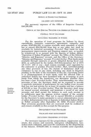 For the operation of trust programs for Indians by direct expenditure, contracts, cooperative agreements, compacts, and grants, $185,984,000, to remain available until expended, of which not to exceed $56,536,000 from this or any other Act, shall be available for historical accounting: Provided, That funds for trust management improvements and litigation support may, as needed, be transferred to or merged with the Bureau of Indian Affairs, ‘‘Operation of Indian Programs’’ account; the Office of the Solicitor, ‘‘Salaries and Expenses’’ account; and the Office of the Secretary, ‘‘Salaries and Expenses’’ account: Provided further, That funds made available through contracts or grants obligated during fiscal year 2010, as authorized by the Indian Self-Determination Act of 1975 (25 U.S.C. 450 et seq.), shall remain available until expended by the contractor or grantee: Provided further, That, notwithstanding any other provision of law, the statute of limitations shall not commence to run on any claim, including any claim in litigation pending on the date of the enactment of this Act, concerning losses to or mismanagement of trust funds, until the affected tribe or individual Indian has been furnished with an accounting of such funds from which the beneficiary can determine whether there has been a loss: Provided further, That, notwithstanding any other provision of law, the Secretary shall not be required to provide a quarterly statement of performance for any Indian trust account that has not had activity for at least 18 months and has a balance of $15.00 or less: Provided further, That the Secretary shall issue an annual account statement and maintain a record of any such accounts and shall permit the balance in each such account to be withdrawn upon the express written request of the account holder: Provided further, That not to exceed $50,000 is available for the Secretary to make payments to correct administrative errors of either disbursements from or deposits to Individual Indian Money or Tribal accounts after September 30, 2002: Provided further, That erroneous payments that are recovered shall be credited to and remain available in this account for this purpose.