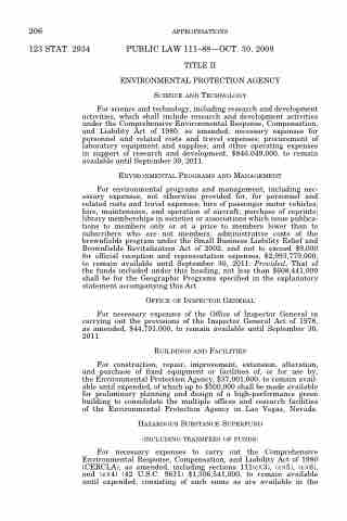 For environmental programs and management, including nec- essary expenses, not otherwise provided for, for personnel and related costs and travel expenses; hire of passenger motor vehicles; hire, maintenance, and operation of aircraft; purchase of reprints; library memberships in societies or associations which issue publica- tions to members only or at a price to members lower than to subscribers who are not members; administrative costs of the brownfields program under the Small Business Liability Relief and Brownfields Revitalization Act of 2002; and not to exceed $9,000 for official reception and representation expenses, $2,993,779,000, to remain available until September 30, 2011: Provided, That of the funds included under this heading, not less than $608,441,000 shall be for the Geographic Programs specified in the explanatory statement accompanying this Act.