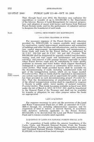 For necessary expenses of the Forest Service, not otherwise provided for, $556,053,000, to remain available until expended, for construction, capital improvement, maintenance and acquisition of buildings and other facilities and infrastructure; and for construc- tion, capital improvement, decommissioning, and maintenance of forest roads and trails by the Forest Service as authorized by 16 U.S.C. 532–538 and 23 U.S.C. 101 and 205: Provided, That $90,000,000 shall be designated for urgently needed road decommis- sioning, road and trail repair and maintenance and associated activities, and removal of fish passage barriers, especially in areas where Forest Service roads may be contributing to water quality problems in streams and water bodies which support threatened, endangered or sensitive species or community water sources: Pro- vided further, That funds provided herein shall be available for the decommissioning of roads, including unauthorized roads not part of the transportation system, which are no longer needed: Provided further, That no funds shall be expended to decommission any system road until notice and an opportunity for public comment has been provided on each decommissioning project: Provided fur- ther, That the decommissioning of unauthorized roads not part of the official transportation system shall be expedited in response to threats to public safety, water quality, or natural resources: Provided further, That funds becoming available in fiscal year 2010 under the Act of March 4, 1913 (16 U.S.C. 501) shall be transferred to the General Fund of the Treasury and shall not be available for transfer or obligation for any other purpose unless the funds are appropriated.