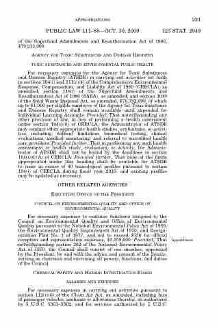 For necessary expenses for the Agency for Toxic Substances and Disease Registry (ATSDR) in carrying out activities set forth in sections 104(i) and 111(c)(4) of the Comprehensive Environmental Response, Compensation, and Liability Act of 1980 (CERCLA), as amended; section 118(f) of the Superfund Amendments and Reauthorization Act of 1986 (SARA), as amended; and section 3019 of the Solid Waste Disposal Act, as amended, $76,792,000, of which up to $1,000 per eligible employee of the Agency for Toxic Substance and Disease Registry shall remain available until expended for Individual Learning Accounts: Provided, That notwithstanding any other provision of law, in lieu of performing a health assessment under section 104(i)(6) of CERCLA, the Administrator of ATSDR may conduct other appropriate health studies, evaluations, or activi- ties, including, without limitation, biomedical testing, clinical evaluations, medical monitoring, and referral to accredited health care providers: Provided further, That in performing any such health assessment or health study, evaluation, or activity, the Adminis- trator of ATSDR shall not be bound by the deadlines in section 104(i)(6)(A) of CERCLA: Provided further, That none of the funds appropriated under this heading shall be available for ATSDR to issue in excess of 40 toxicological profiles pursuant to section 104(i) of CERCLA during fiscal year 2010, and existing profiles may be updated as necessary.