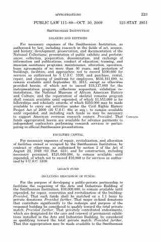 For the purpose of developing a public-private partnership to facilitate the reopening of the Arts and Industries Building of the Smithsonian Institution, $30,000,000, to remain available until expended, for repair, renovation and revitalization of the building: Provided, That such funds shall be matched on a 1:1 basis by private donations: Provided further, That major in-kind donations that contribute significantly to the redesign and purpose of the reopened building be considered to qualify toward the total private match: Provided further, That privately contributed endowments, which are designated for the care and renewal of permanent exhibi- tions installed in the Arts and Industries Building, be considered as qualifying toward the total private match: Provided further, That this appropriation may be made available to the Smithsonian