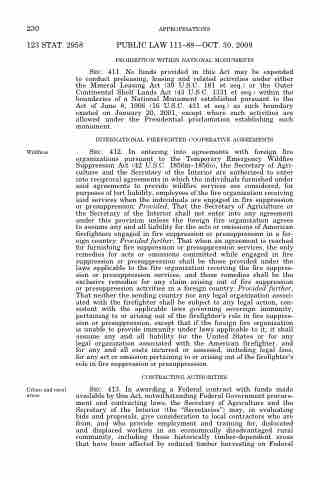 SEC. 412. In entering into agreements with foreign fire organizations pursuant to the Temporary Emergency Wildfire Suppression Act (42 U.S.C. 1856m–1856o), the Secretary of Agri- culture and the Secretary of the Interior are authorized to enter into reciprocal agreements in which the individuals furnished under said agreements to provide wildfire services are considered, for purposes of tort liability, employees of the fire organization receiving said services when the individuals are engaged in fire suppression or presuppression: Provided, That the Secretary of Agriculture or the Secretary of the Interior shall not enter into any agreement under this provision unless the foreign fire organization agrees to assume any and all liability for the acts or omissions of American firefighters engaged in fire suppression or presuppression in a for- eign country: Provided further, That when an agreement is reached for furnishing fire suppression or presuppression services, the only remedies for acts or omissions committed while engaged in fire suppression or presuppression shall be those provided under the laws applicable to the fire organization receiving the fire suppres- sion or presuppression services, and those remedies shall be the exclusive remedies for any claim arising out of fire suppression or presuppression activities in a foreign country: Provided further, That neither the sending country nor any legal organization associ- ated with the firefighter shall be subject to any legal action, con- sistent with the applicable laws governing sovereign immunity, pertaining to or arising out of the firefighter’s role in fire suppres- sion or presuppression, except that if the foreign fire organization is unable to provide immunity under laws applicable to it, it shall assume any and all liability for the United States or for any legal organization associated with the American firefighter, and for any and all costs incurred or assessed, including legal fees, for any act or omission pertaining to or arising out of the firefighter’s role in fire suppression or presuppression.