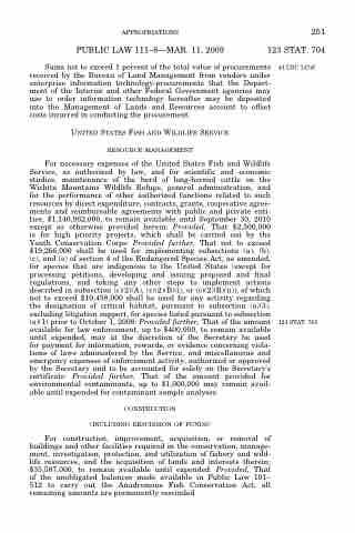 For necessary expenses of the United States Fish and Wildlife Service, as authorized by law, and for scientific and economic studies, maintenance of the herd of long-horned cattle on the Wichita Mountains Wildlife Refuge, general administration, and for the performance of other authorized functions related to such resources by direct expenditure, contracts, grants, cooperative agree- ments and reimbursable agreements with public and private enti- ties, $1,140,962,000, to remain available until September 30, 2010 except as otherwise provided herein: Provided, That $2,500,000 is for high priority projects, which shall be carried out by the Youth Conservation Corps: Provided further, That not to exceed $19,266,000 shall be used for implementing subsections (a), (b), (c), and (e) of section 4 of the Endangered Species Act, as amended, for species that are indigenous to the United States (except for processing petitions, developing and issuing proposed and final regulations, and taking any other steps to implement actions described in subsection (c)(2)(A), (c)(2)(B)(i), or (c)(2)(B)(ii)), of which not to exceed $10,458,000 shall be used for any activity regarding the designation of critical habitat, pursuant to subsection (a)(3), excluding litigation support, for species listed pursuant to subsection (a)(1) prior to October 1, 2008: Provided further, That of the amount available for law enforcement, up to $400,000, to remain available until expended, may at the discretion of the Secretary be used for payment for information, rewards, or evidence concerning viola- tions of laws administered by the Service, and miscellaneous and emergency expenses of enforcement activity, authorized or approved by the Secretary and to be accounted for solely on the Secretary’s certificate: Provided further, That of the amount provided for environmental contaminants, up to $1,000,000 may remain avail- able until expended for contaminant sample analyses.