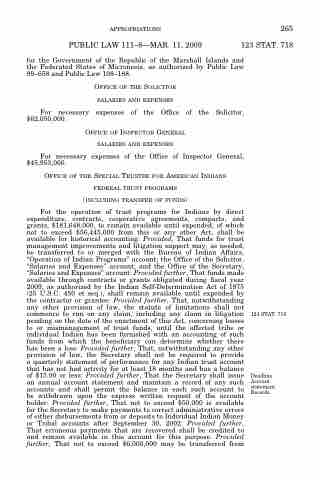 For the operation of trust programs for Indians by direct expenditure, contracts, cooperative agreements, compacts, and grants, $181,648,000, to remain available until expended, of which not to exceed $56,445,000 from this or any other Act, shall be available for historical accounting: Provided, That funds for trust management improvements and litigation support may, as needed, be transferred to or merged with the Bureau of Indian Affairs, ‘‘Operation of Indian Programs’’ account; the Office of the Solicitor, ‘‘Salaries and Expenses’’ account; and the Office of the Secretary, ‘‘Salaries and Expenses’’ account: Provided further, That funds made available through contracts or grants obligated during fiscal year 2009, as authorized by the Indian Self-Determination Act of 1975 (25 U.S.C. 450 et seq.), shall remain available until expended by the contractor or grantee: Provided further, That, notwithstanding any other provision of law, the statute of limitations shall not commence to run on any claim, including any claim in litigation pending on the date of the enactment of this Act, concerning losses to or mismanagement of trust funds, until the affected tribe or individual Indian has been furnished with an accounting of such funds from which the beneficiary can determine whether there has been a loss: Provided further, That, notwithstanding any other provision of law, the Secretary shall not be required to provide a quarterly statement of performance for any Indian trust account that has not had activity for at least 18 months and has a balance of $15.00 or less: Provided further, That the Secretary shall issue an annual account statement and maintain a record of any such accounts and shall permit the balance in each such account to be withdrawn upon the express written request of the account holder: Provided further, That not to exceed $50,000 is available for the Secretary to make payments to correct administrative errors of either disbursements from or deposits to Individual Indian Money or Tribal accounts after September 30, 2002: Provided further, That erroneous payments that are recovered shall be credited to and remain available in this account for this purpose: Provided further, That not to exceed $6,000,000 may be transferred from