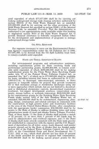 For environmental programs and infrastructure assistance, including capitalization grants for State revolving funds and performance partnership grants, $2,968,464,000, to remain avail- able until expended, of which $689,080,000 shall be for making capitalization grants for the Clean Water State Revolving Funds under title VI of the Federal Water Pollution Control Act, as amended (the ‘‘Act’’); of which up to $75,000,000 shall be available for loans, including interest free loans as authorized by 33 U.S.C. 1383(d)(1)(A), to municipal, inter-municipal, interstate, or State agencies or nonprofit entities for projects that provide treatment for or that minimize sewage or stormwater discharges using one or more approaches which include, but are not limited to, decentral- ized or distributed stormwater controls, decentralized wastewater treatment, low-impact development practices, conservation ease- ments, stream buffers, or wetlands restoration; $829,029,000 shall be for capitalization grants for the Drinking Water State Revolving Funds under section 1452 of the Safe Drinking Water Act, as amended; $20,000,000 shall be for architectural, engineering, plan- ning, design, construction and related activities in connection with the construction of high priority water and wastewater facilities in the area of the United States-Mexico Border, after consultation with the appropriate border commission; $18,500,000 shall be for grants to the State of Alaska to address drinking water and waste infrastructure needs of rural and Alaska Native Villages: Provided, That, of these funds: (1) the State of Alaska shall provide a match of 25 percent; (2) no more than 5 percent of the funds may be used for administrative and overhead expenses; and (3) the State of Alaska shall make awards consistent with the State-wide priority list established in conjunction with the Agency and the U.S. Depart- ment of Agriculture for all water, sewer, waste disposal, and similar projects carried out by the State of Alaska that are funded under section 221 of the Federal Water Pollution Control Act (33 U.S.C. 1301) or the Consolidated Farm and Rural Development Act (7 U.S.C. 1921 et seq.) which shall allocate not less than 25 percent of the funds provided for projects in regional hub communities; $145,000,000 shall be for making special project grants for the