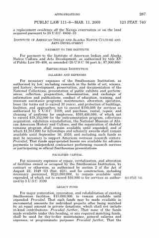 For necessary expenses of the Smithsonian Institution, as authorized by law, including research in the fields of art, science, and history; development, preservation, and documentation of the National Collections; presentation of public exhibits and perform- ances; collection, preparation, dissemination, and exchange of information and publications; conduct of education, training, and museum assistance programs; maintenance, alteration, operation, lease (for terms not to exceed 30 years), and protection of buildings, facilities, and approaches; not to exceed $100,000 for services as authorized by 5 U.S.C. 3109; and purchase, rental, repair, and cleaning of uniforms for employees, $593,400,000, of which not to exceed $19,352,000 for the instrumentation program, collections acquisition, exhibition reinstallation, the National Museum of Afri- can American History and Culture, and the repatriation of skeletal remains program shall remain available until expended; and of which $1,553,000 for fellowships and scholarly awards shall remain available until September 30, 2010; and including such funds as may be necessary to support American overseas research centers: Provided, That funds appropriated herein are available for advance payments to independent contractors performing research services or participating in official Smithsonian presentations.