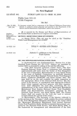 ‘‘(28) NEW ENGLAND NATIONAL SCENIC TRAIL.—The New England National Scenic Trail, a continuous trail extending approximately 220 miles from the border of New Hampshire in the town of Royalston, Massachusetts to Long Island Sound in the town of Guilford, Connecticut, as generally depicted on the map titled ‘New England National Scenic Trail Proposed Route’, numbered T06/80,000, and dated October 2007. The map shall be on file and available for public inspection in the appropriate offices of the National Park Service. The Sec- retary of the Interior, in consultation with appropriate Federal, State, tribal, regional, and local agencies, and other organiza- tions, shall administer the trail after considering the rec- ommendations of the report titled the ‘Metacomet Monadnock Mattabesset Trail System National Scenic Trail Feasibility Study and Environmental Assessment’, prepared by the National Park Service, and dated Spring 2006. The United States shall not acquire for the trail any land or interest in land without the consent of the owner.’’.