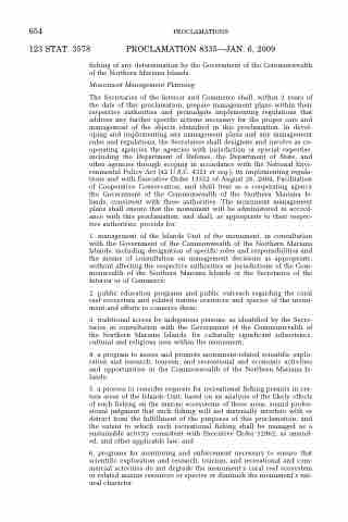 The Secretaries of the Interior and Commerce shall, within 2 years of the date of this proclamation, prepare management plans within their respective authorities and promulgate implementing regulations that address any further specific actions necessary for the proper care and management of the objects identified in this proclamation. In devel- oping and implementing any management plans and any management rules and regulations, the Secretaries shall designate and involve as co- operating agencies the agencies with jurisdiction or special expertise, including the Department of Defense, the Department of State, and other agencies through scoping in accordance with the National Envi- ronmental Policy Act (42 U.S.C. 4321 et seq.), its implementing regula- tions and with Executive Order 13352 of August 26, 2004, Facilitation of Cooperative Conservation, and shall treat as a cooperating agency the Government of the Commonwealth of the Northern Mariana Is- lands, consistent with these authorities. The monument management plans shall ensure that the monument will be administered in accord- ance with this proclamation, and shall, as appropriate to their respec- tive authorities, provide for: