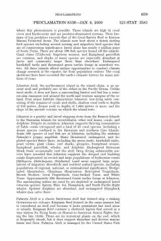 where this phenomenon is possible. These islands are high in coral cover and biodiversity and are predator-dominated systems. Their bio- mass of top predators exceeds that of the Great Barrier Reef or Kenyan Marine Protected Areas. The islands now host about a dozen nesting bird species including several nesting and migratory bird species that are of conservation significance. Jarvis alone has nearly 3 million pairs of Sooty Terns. There are about 300 fish species found off the islands. Giant clams (Tridacna), Napoleon wrasses, and Bumphead parrotfish are common, and sharks of many species are especially abundant at Jarvis and commonly larger there than elsewhere. Endangered hawksbill turtle and threatened green turtles forage in nearshore wa- ters. All three islands afford unique opportunities to conduct climate change research at the equator, far from population centers. The coral skeletons there have recorded the earth’s climatic history for many mil- lions of years.