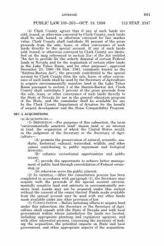 (4) Clark County agrees that if any of such lands are sold, leased, or otherwise conveyed by Clark County, such lands shall be sold, leased, or otherwise conveyed for fair market value. Clark County shall contribute 85 percent of the gross proceeds from the sale, lease, or other conveyance of such lands directly to the special account. If any of such lands sold, leased, or otherwise conveyed by Clark County are identi- fied on the map referenced in section 2(a) of the Act entitled ‘‘An Act to provide for the orderly disposal of certain Federal lands in Nevada and for the acquisition of certain other lands in the Lake Tahoe Basin, and for other purposes’’, approved December 23, 1980 (94 Stat. 3381; commonly known as the ‘‘Santini-Burton Act’’), the proceeds contributed to the special account by Clark County from the sale, lease, or other convey- ance of such lands shall be used by the Secretary of Agriculture to acquire environmentally sensitive land in the Lake Tahoe Basin pursuant to section 3 of the Santini-Burton Act. Clark County shall contribute 5 percent of the gross proceeds from the sale, lease, or other conveyance of such lands directly to the State of Nevada for use in the general education program of the State, and the remainder shall be available for use by the Clark County Department of Aviation for the benefit of airport development and the Noise Compatibility Program.