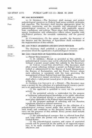 (a) IN GENERAL.—The Secretary shall manage and protect paleontological resources on Federal land using scientific principles and expertise. The Secretary shall develop appropriate plans for inventory, monitoring, and the scientific and educational use of paleontological resources, in accordance with applicable agency laws, regulations, and policies. These plans shall emphasize inter- agency coordination and collaborative efforts where possible with non-Federal partners, the scientific community, and the general public.