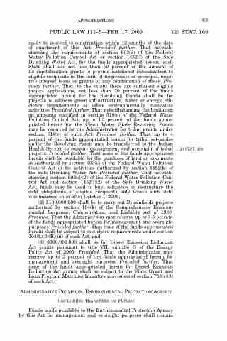 ready to proceed to construction within 12 months of the date of enactment of this Act: Provided further, That notwith- standing the requirements of section 603(d) of the Federal Water Pollution Control Act or section 1452(f) of the Safe Drinking Water Act, for the funds appropriated herein, each State shall use not less than 50 percent of the amount of its capitalization grants to provide additional subsidization to eligible recipients in the form of forgiveness of principal, nega- tive interest loans or grants or any combination of these: Pro- vided further, That, to the extent there are sufficient eligible project applications, not less than 20 percent of the funds appropriated herein for the Revolving Funds shall be for projects to address green infrastructure, water or energy effi- ciency improvements or other environmentally innovative activities: Provided further, That notwithstanding the limitation on amounts specified in section 518(c) of the Federal Water Pollution Control Act, up to 1.5 percent of the funds appro- priated herein for the Clean Water State Revolving Funds may be reserved by the Administrator for tribal grants under section 518(c) of such Act: Provided further, That up to 4 percent of the funds appropriated herein for tribal set-asides under the Revolving Funds may be transferred to the Indian Health Service to support management and oversight of tribal projects: Provided further, That none of the funds appropriated herein shall be available for the purchase of land or easements as authorized by section 603(c) of the Federal Water Pollution Control Act or for activities authorized by section 1452(k) of the Safe Drinking Water Act: Provided further, That notwith- standing section 603(d)(2) of the Federal Water Pollution Con- trol Act and section 1452(f)(2) of the Safe Drinking Water Act, funds may be used to buy, refinance or restructure the debt obligations of eligible recipients only where such debt was incurred on or after October 1, 2008;