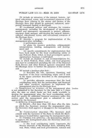 ways in which Federal, State, tribal, and local programs may best be coordinated (including the role of the National Park Service and other Federal agencies associated with the Heritage Area) to further the purposes of this section; and