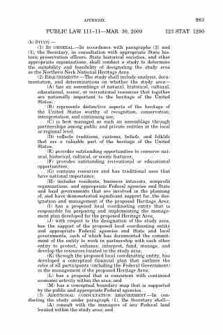 (2) REQUIREMENTS.—The study shall include analysis, docu- mentation, and determinations on whether the study area— (A) has an assemblage of natural, historical, cultural, educational, scenic, or recreational resources that together are nationally important to the heritage of the United