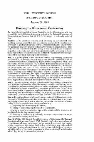 Section 1. To promote economy and efficiency in Government con- tracting, certain costs that are not directly related to the contractors’ provision of goods and services to the Government shall be unallowable for payment, thereby directly reducing Government expenditures. This order is also consistent with the policy of the United States to remain impartial concerning any labor-management dispute involving Govern- ment contractors. This order does not restrict the manner in which recipi- ents of Federal funds may expend those funds.