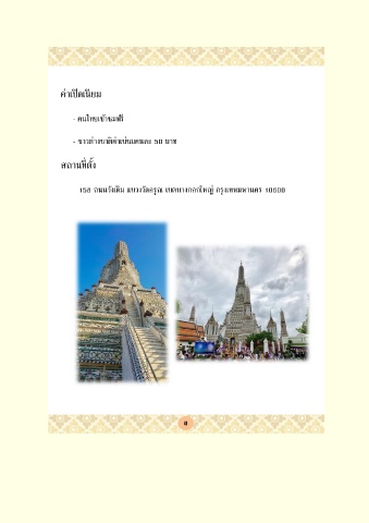 ค่ำเปิดเนียม - คนไทยเข้ำชมฟรี - ชำวต่ำงชำติค่ำเข่ชมคนละ 50 บำท สถำนที่ตั้ง 158 ถนนวังเดิม แขวงวัดอรุณ เขตบำงกอกใหญ่ กรุงเทพมหำนคร 10600 8