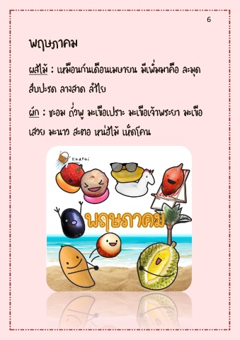 6 พฤษภำคม ผลไม้ : เหมือนกันเดือนเมษำยน มีเพิ่มมำคือ ละมุด สับปะรด ลำงสำด ล ำไย ผัก : ชะอม ถั่วพู มะเขือเปรำะ มะเขือเจ้ำพระยำ มะเขือ เสวย มะนำว สะตอ หน่อไม้ เห็ดโคน