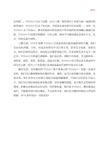 微信生活。没有微信的 TUHAO TUHAO 算不算真正的 TUHAO TUHAO ?答案一定是否 定的。他们可以整夜整夜地在微信作诗、调笑 也可以连续数日面无表情 呆 若木鸡。他们在你生日时劈头盖脸无限量地砸微糕 可他们记住的生日没几 个。他们可以很轻易地在朋友圈点赞 给你温馨的鼓励 也可能完全忽视你的 感受 好像从来都没有认识过你。但你要知道 他们是 TUHAO 微信要适应 他们 他们 他们 不能要求他们适应微信。不过没有关系 他们在关键的时候会大声给你 祝福:2014 新年快乐!马到成功!
