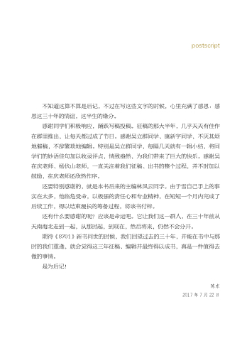 期待《8701》新书问世的时候 我们回望过去的三十年 并能在书中与那 时的我们重逢 就会觉得这三年征稿、编辑并最终得以成书 真是一件值得去 做的事情。
