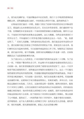 为了表白对心上人的思念 C 同学那时写的情书足足有二十页啊。为了见 上一面 不惜放下繁杂的社会工作 扒运煤火车长途跋涉也要赶到邵武去见上 白姑娘一面。我们系里短跑冠军又获得了爱情马拉松的冠军了。这么一个在学 校里不缺乏爱情的男子 居然被远在异地的白姑娘抓住了心。这么一个石破天 惊的爱情当然也有冷场的时候 但是随后掀起的是更猛烈的爱的波浪。毕竟 C 同学是分配到福州 可白姑娘一直在邵武 他们应该是聚少离多吧。但是就像 这浪漫的开始 这爱情对于双方都是刻骨铭心 至真至诚的。多年以后 白姑 娘远远跑到日本发展。几年后 又放弃那边的一段爱情 毅然回到国内 跟我 们 C 同学订立婚约。以至白姑娘在日本的追求者从日本追到国内 在机场怯怯 地难以相信地问:他对你有那么深的吸引力吗?说真的 我作为旁观者也多次 怀疑这段情会有什么结果。到了我参加 C 同学和白姑娘的三明婚礼 倒让我圆 了心中疑惑 真的成了。一次我带妻子到 C 同学家中 我妻子看到白姑娘时 还怀疑地说:这个女人真有那么大的吸引力吗?没有见证怎么会知道 爱有多 深 情归何处啊。那天那地那时候 那是上天注定的缘分啊!