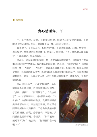 丫会全票通过。记得 毕业二十 周年聚时 搭忠建的车去的厦门 在车上 他就说:“丫 他妈的人缘太好 了!”羡慕嫉妒 只是不敢恨 毕业后 和同学们长期失联 第一个取得联系的就是丫。当时从昔日的同 事那里得到了丫的电话。我打电话和他闲聊 总会问:“你在忙吗?”他总是 轻轻一笑:“没有” “不会”。总是那么善解人意。后来我想 他要是说在 忙的话 岂不是把电话挂了?恐怕他也担心我会有事找他给误了 而我不过是 闲聊而已。后来 也就少了电话。8701 的微信时代来了 感谢微信 让我们 不再失联!