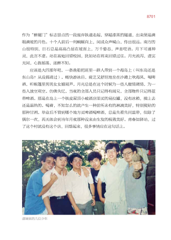 应该是大四那年吧 一条渔船把班里一群人带到一个海岛上(叫东岛还是 东山岛?从没搞清过)。畅快游泳后 疲乏又舒坦地坐在沙滩上吹海风 喝啤 酒 听帐篷里男男女女嬉闹声。月光总是在这个时候为一些人催情调情 为一 为一 些人放空观空。仿佛失忆 当夜的全部人员只记得有闽兄 全部物件只记得蓝 带啤酒。那是在岛上一个铁皮屋顶小破酒店里买的易拉罐 没有冰箱 摸上去 还是温热的。喝着 不知怎么的就产生一种前所未有的淋漓美好 特別熨贴的 那种甘洌。毕业后不管到哪个地方买啤酒喝啤酒 总是先看先问蓝带 但除了 偶尔一次 再无体会到当年月夜那种没来由生发的极致美好。青春如驿站 过 了这个村就没有这个店 回想起来 很多事情应在这句话上。