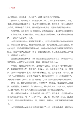 那个时候逃学的滋味 和现在可是大不一样了:提心吊胆 总觉得老师突 然会从背后走出来 叫一声自己的名字。不过 有一次我在路上闲逛 真遇到 了老师 她只是问我干嘛没去上课 我说要上医院去 老师就轻易地相信我 了。 永忠逃课到河边捕鱼的场景着实让我吃了一惊 特别是吃樱桃。我相信这