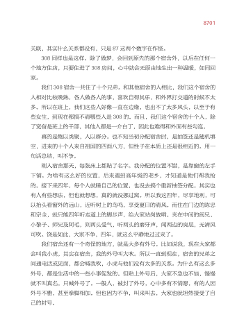 我们 我们 308 宿舍一共住了十个兄弟。和其他宿舍的人相比 我们这个宿舍的 人相对比较晚熟 各人做各人的事 喜欢自得其乐 和外界打交道的时候不太 多。所以在班上 我们这些人好像一直在边缘 也出不了太多风头 以至于有 些女生 到现在都搞不清哪些人是 308 的。而且 我们这个宿舍的十个人 除 了宽奋是班上的干部 其他人都是一介白丁 因此也难得和外面有些勾连。