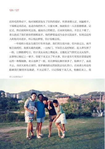 在阿毛的带动下 他对围棋却发生了狂热的爱好。所谓老僧入定 闲敲棋子。 下围棋这项活动 也适合他的性子。只要无事 他就独自一人在那摆棋谱 记 定式 然后就和阿毛实战 提高自己的棋艺。后来阿毛转向 不怎么下棋了 老头就成了我们宿舍的围棋高手。他的梦想是成为业余五段高手 但周边没有 人和他共同进步 所以他这梦想 估计很难实现。