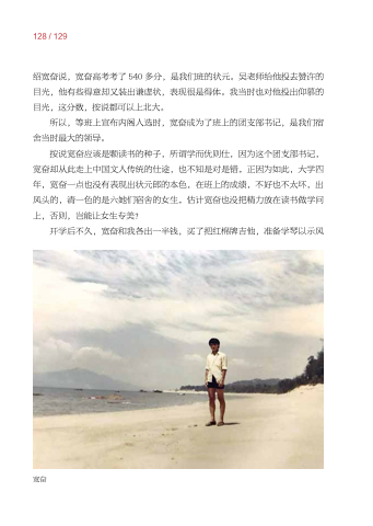 按说宽奋应该是颗读书的种子 所谓学而优则仕 因为这个团支部书记 宽奋却从此走上中国文人传统的仕途 也不知是对是错。正因为如此 大学四 年 宽奋一点也没有表现出状元郎的本色 在班上的成绩 不好也不太坏 出 出 风头的 清一色的是六她们宿舍的女生。估计宽奋也没把精力放在读书做学问 上 否则 岂能让女生专美?