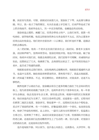 既然选择了以政治为业 宽奋确实将自己更多的精力放在了社会知识的历 练上。他为系里和班级做了很多工作 也和外系学生干部多有往来。有一年系 学生会换届 他去竞选学生会主席 曾经受过伤害。根据中国的民主制度原 则 他应该是内定为主席了 但民主选举的过程 还是要走一走的。记得当时 在群贤二搞民主投票 宽奋讲完 倒也掌声一片 没想到后来杀出个程咬金 差点坏了宽奋的好事。有一个自修生 好像是部队里的一个营长 也来参加选 举。他穿了件绿色军棉袄 走上讲台 一副吊儿郎当无所谓的样子 很是粪土 主席之位 结果得了个票王。虽说后来宽奋还是成了主席 但那部队中历练出 的老江湖 还是给我们这些幼稚的学生上了生动的一课。估计这事 对宽奋日 后的政治生涯 还是很有启发作用的。