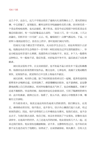 但闽兄只是个踏实苦干的家伙 天天给学生会出力 却没有得到什么好 处。他既没有在学生会得到个一官半职(树旺说他当过学生部的副部长) 毕 业分配也没有享受什么照顾 我真的有点为他抱不平。其实 乡下人一般都有 这种特点 牛一般地干活 隐忍负重 对好处却不争不夺 最后就成了无私奉 献者。