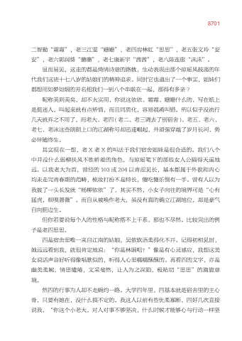 昵称美则美矣 却不太实用 你说这依依、霜霜、姗姗什么的 写在纸上 是挺迷人 叫起来就有点矫情 而且同质化 容易混淆叫错。所以似乎没流行 几天就弃之不用了 而老大、老四 ( 老二、老三调去了别宿舍 )、老五、老六、 老七、老沫这些朗朗上口的江湖称号却迅速崛起 并顽强穿越了岁月长河 势 必伴随终生。