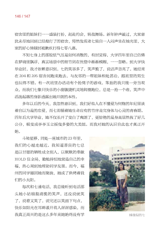 不知七身上的那股低气压是如何消散的 有时觉得 大学四年里自己仿佛 在梦境里飘浮 真实场景中的细节则在恍惚中渐渐模糊 一一忽略。到大学快 毕业时 我才依稀意识到 七的笑容多了 笑声脆了 说话声音亮了。她经常 在 204 和 205 宿舍间跑来跑去 与友邻的一帮姐妹相处甚洽 跟班里的男生 也玩得不错。有一次班里办活动有个抢凳子的游戏 笨拙的我只能一旁当观 众 而我们七像只快乐的小鹿敏捷机灵地转圈跑位 总是一抢一个准 笑声中 活泼起落的身影透露出她开朗的本性。