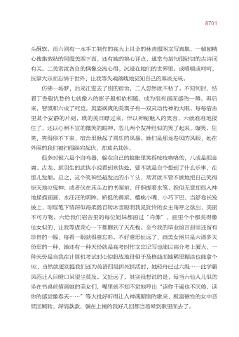 仿佛一场梦 后来江雯去了别的宿舍 二人忽然就不粘了。不知何时 结 着丁香般忧愁的七就像六的影子般相依相随 成为很有画面感的一幕。再后 来 智瑛和六成了死党。英姿飒爽的美瑛子有一双灵动传神的大眼。每每宿舍 里某个安静的片刻 瑛的美目瞟过来 伴以神秘魅人的笑容 六就准准地接 住了 还以心照不宣的微笑的眼神 忽儿两个发神经似的笑了起来 爆笑 狂 笑 笑 笑得停不下来 宿舍里掀起了喜乐的风暴。她们是那龙卷风的风眼 处在 外围的我们被扫得跌宕起伏 却莫名其妙。