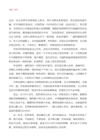 年轻时的喜欢就是这么任性 没有太多的理由 不求具体的结果 只听从 内心的召唤。对建的感情 是对一个才华出众的大哥的仰慕 对一个思想成熟 行为洒脱的男子的欣喜 毫不掩饰 更无须言说。当建和我最喜爱最欣赏的班 级女神走在一起的时候 在我眼里 这是上苍至美的安排。