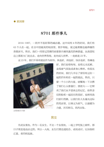 这 23 年 我们不再有彼此作为依恃。风也好 雨也好 快乐也好 伤痛也 好 我们走得匆匆 走得义无反顾 走得意气风发或者身心憔悴。有很长 的时间 我们几乎忘了曾经有过在一 起的四年和在一起的彼此 然而 只 要一个小小的火星 就唰地一下点燃 了我们心头那盏灯、那团火——它照 亮了我们从不曾淡忘的记忆、依然亲 切的脸和一起经历的美好 也照亮我 们前行的路 让我们在人生漫无边际 的荒凉里 以情义为底气 以温暖为