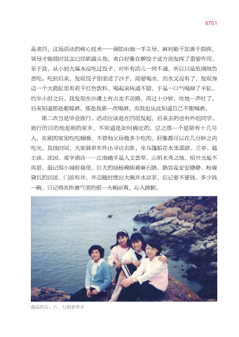 是老四 这场活动的核心技术——调馅由她一手主导 麻利能干加善于指挥 领导才能那时其实已经崭露头角。老白好像在擀饺子皮方面发挥了重要作用。 至于我 从小到大基本没吃过饺子 对所有活儿一窍不通 所以只是低调地负 责吃。吃到后来 发现饺子馅里进了沙子 需要喝水 而水又没有了 发现身 边一个大瓷缸里有若干红色饮料 喝起来味道不错 于是一口气喝掉了半缸。 约半小时之后 我发现在沙滩上有点走不动路 再过十分钟 哇地一声吐了。 后来知道那是葡萄酒 那是我第一次喝酒 而我也从此知道自己不能喝酒。