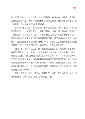 此刻 那一段时光已走远 那一段记忆已泛黄。在一次次的久别重逢中 我们总想留下点什么。于是 就有了最初的 ChinaRen 有了后来的 QQ 群 再后来 又有了现在的厦大中文八七 LOVE 部落。我们 又可以隔空谈情 又可以作诗吃醋 又可以云淡风清地谈论着曾经的爱恋与现在的一切 还可以 继续轰轰烈烈地再谈一场天长地久的恋爱 虽然 我的心依旧在想念 我的 我的 身影依旧是那样清薄。但 手中握着的素笔 只画我的长发为你们飞扬 不再 写满地黄花等待的惆怅 有你 有你 有你们 真好!遇见你 遇见你们 是我一辈子的幸福。从此 无 论今后我们身在哪个角落 我们的心永远在一起!