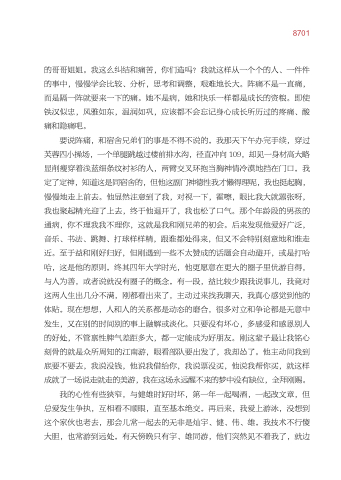 的哥哥姐姐。我这么纠结和痛苦 你们造吗?我就这样从一个个的人、一件件 的事中 慢慢学会比较、分析 思考和调整 艰难地长大。阵痛不是一直痛 而是隔一阵就要来一下的痛。她不是病 她和快乐一样都是成长的资粮。即使 铁汉似忠 风雅如东 温润如巩 应该都不会忘记身心成长所历过的疼痛、酸 痛和隐痛吧。