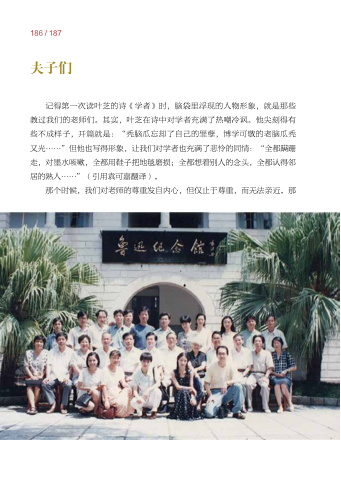 186 / 187 夫子们 记得第一次读叶芝的诗《学者》时 脑袋里浮现的人物形象 就是那些 教过我们的老师们。其实 叶芝在诗中对学者充满了热嘲冷讽。他尖刻得有 些不成样子 开篇就是:“秃脑瓜忘却了自己的罪孽 博学可敬的老脑瓜秃 又光 ”但他也写得形象 让我们对学者也充满了悲怜的同情:“全都蹒跚 走 对墨水咳嗽 全都用鞋子把地毯磨损 全都想着别人的念头 全都认得邻 居的熟人 ”(引用袁可嘉翻译)。 那个时候 我们对老师的尊重发自内心 但仅止于尊重 而无法亲近。那