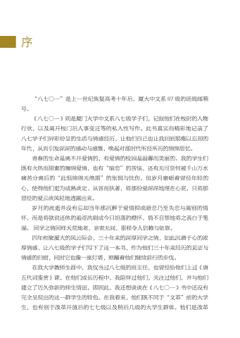 四年相聚厦大的风云际会 三十年来的深厚同学之情 如此沉潜于心的浓 厚情感 让八七级的学子们写下了这一本书 作为他们三十年来经历的见证与 情感的归宿 同时它也像一座灯塔 照耀着他们继续前行的步伐。