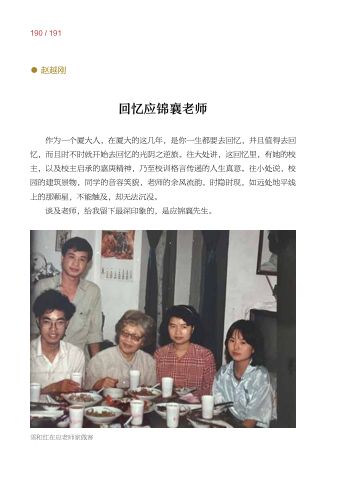 190 / 191 ● 赵越刚 回忆应锦襄老师 作为一个厦大人 在厦大的这几年 是你一生都要去回忆 并且值得去回 忆 忆 忆 而且时不时就开始去回忆的光阴之逆旅。往大处讲 这回忆里 有她的校 主 主 以及校主启承的嘉庚精神 乃至校训格言传递的人生真意。往小处说 校 校 校 园的建筑景物 同学的音容笑貌 老师的余风流韵 时隐时现 如远处地平线 上的那颗星 不能触及 却无法沉没。 谈及老师 给我留下最深印象的 是应锦襄先生。 雪和红在应老师家做客