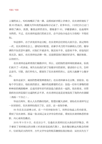 在庆老师还是希望我们能做学问 所以 还把他的恩师周祖谟请来 给我 们班开了一次讲座。周先生给我们讲了些做学问的原则 要读些什么书 怎样 去读书。可惜 我们所有人 都辜负了在庆老师的苦心 没有人能静下心做学 问。