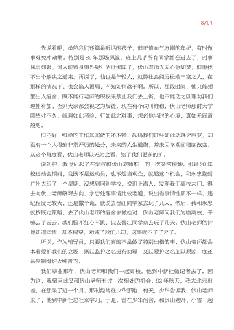 先说看吧 虽然我们还算是听话的孩子 但正值血气方刚的年纪 有时做 事难免冲动啊。特别是 89 年那场风波 班上几乎所有同学都卷进去了 时事 风雨如磐 何人能置身事外呢?估计那阵子 伏山老师天天心急如焚 但也找 不出个解决之道来。再说了 他也是年轻人 就算社会阅历极端丰富之人 在 那样的情况下 也会陷入困局 不知如何落子啊。所以 那段时间 他只能频 繁出入宿舍 既不能行老师的职权来禁止我们去上街 也不能动之以理劝我们 理性有加 否则大家都会视之为叛徒。现在有个词叫维稳 伏山老师那时大学 刚毕业不久 就遇如此考验 行如此之难事 想必他当时的心境 真如无间道 般吧。
