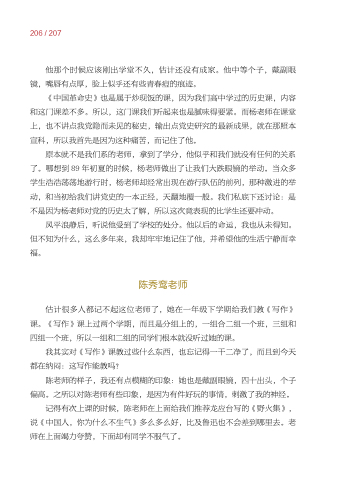 原本就不是我们系的老师 拿到了学分 他似乎和我们就没有任何的关系 了。哪想到 89 年初夏的时候 杨老师做出了让我们大跌眼镜的举动。当众多 学生浩浩荡荡地游行时 杨老师却经常出现在游行队伍的前列 那种激进的举 动 和当初给我们讲党史的一本正经 天翻地覆一般。我们私底下还讨论:是 不是因为杨老师对党的历史太了解 所以这次竟表现的比学生还要冲动。