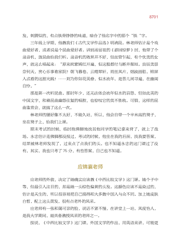 发 刺猬似的 有点铁骨铮铮的味道 暗合了他名字中的那个“铁“字。 三年级上学期 他教我们《古代文学作品选》明清段。林老师估计是个戏 曲爱好者 曲爱好者 或者说是个昆曲爱好者。讲到汤显祖的《游园惊梦》时 他带了个 录音机 录音机 放昆曲给我们听。录音机的效果并不好 但丝管乍起 有个优美的女 声 就这么唱起来:“原来姹紫嫣红开遍 似这般都付与断井颓垣。良辰美景 奈何天 赏心乐事谁家院?朝飞暮卷 云霞翠轩 雨丝风片 烟波画船 锦屏 人忒看的这韶光贱! 则为你如花美眷 似水流年 是答儿闲寻遍 在幽闺